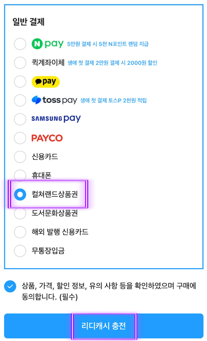 2. 컬쳐랜드로 리디캐시 충전하는 방법