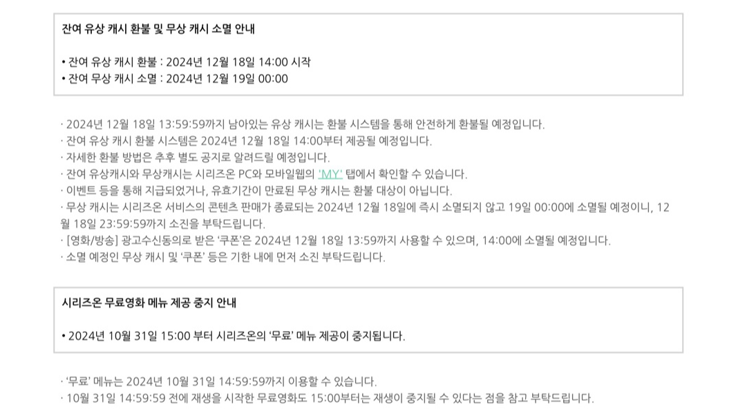 | 기존 혜택 | 시리즈온 영화 무제한 이용권 종료 (24년 11월 11일 23:59:59까지 선택가능, 12월 12일 종료) |