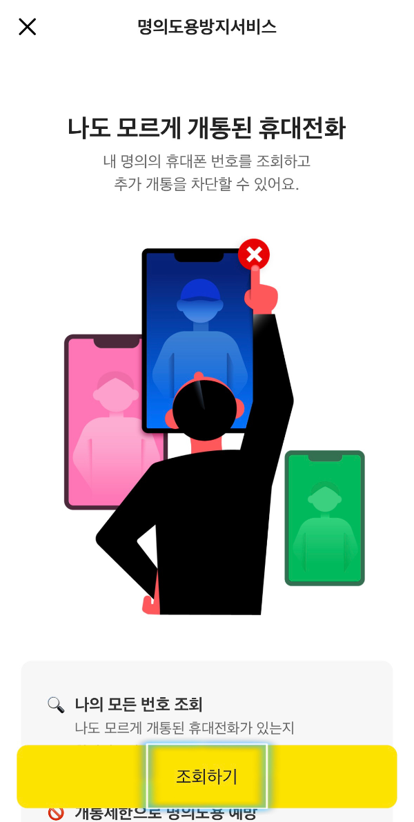 먼저 내 명의 휴대전화에서 내가 개통한 휴대전화만 가입되어 있는지 확인해주세요