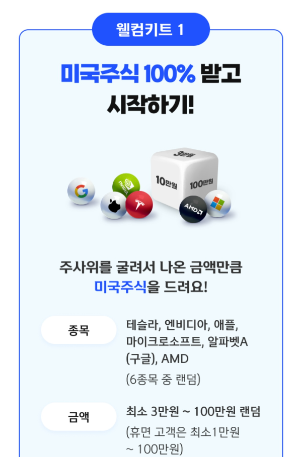 테슬라, 엔비디아, 애플, 마이크로소프트, 알파벳 A, AMD 6 종목 중에 하나를 3만 원~100만 원 랜덤으로 줍니다.