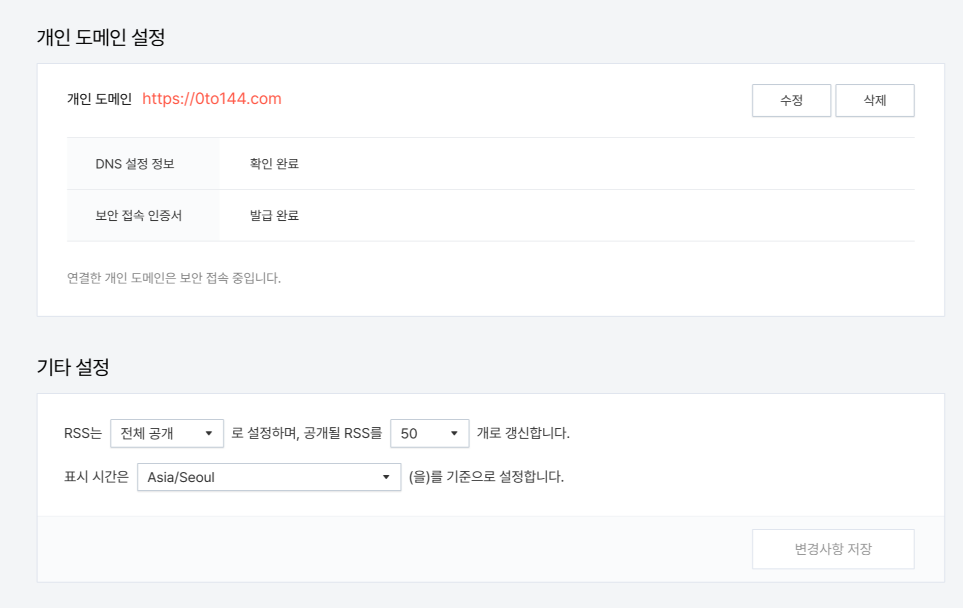 3. 개인 도메인 설정 : 관리-블로그-개인 도메인 설정