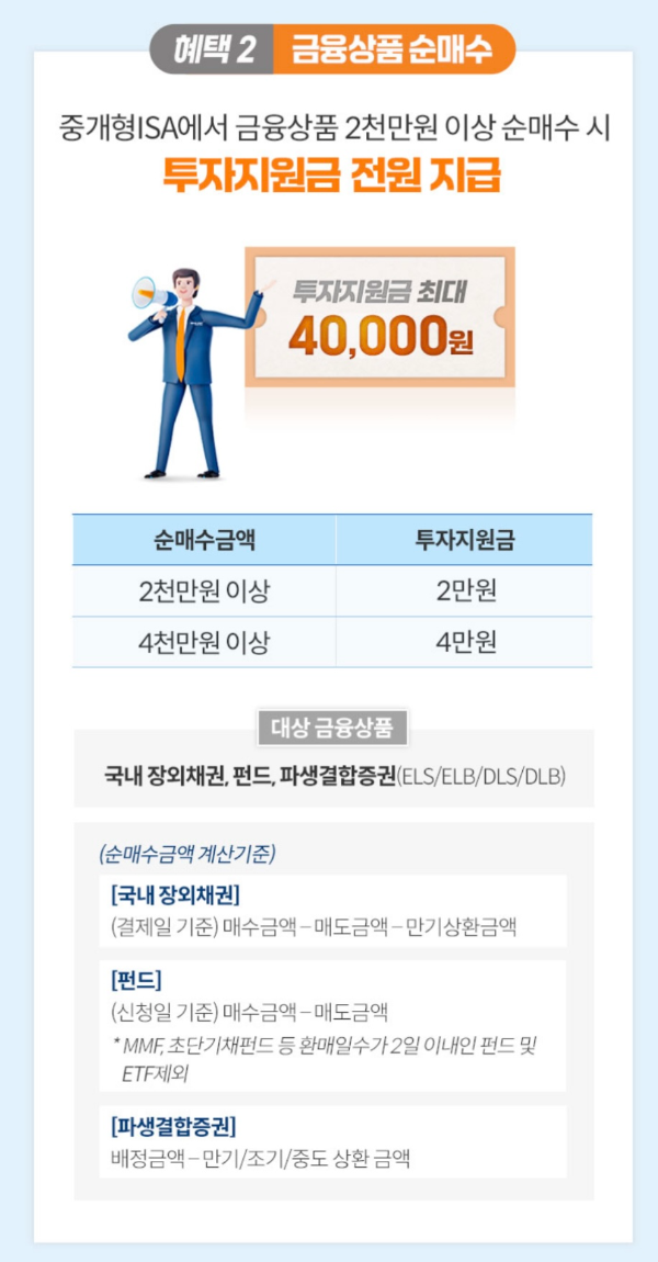 중개형 ISA에서 금융상품(국내 장외채권, 펀드, 파생결합증권)을 2천만 원 이상 / 4천만 원 이상 순매수하면,